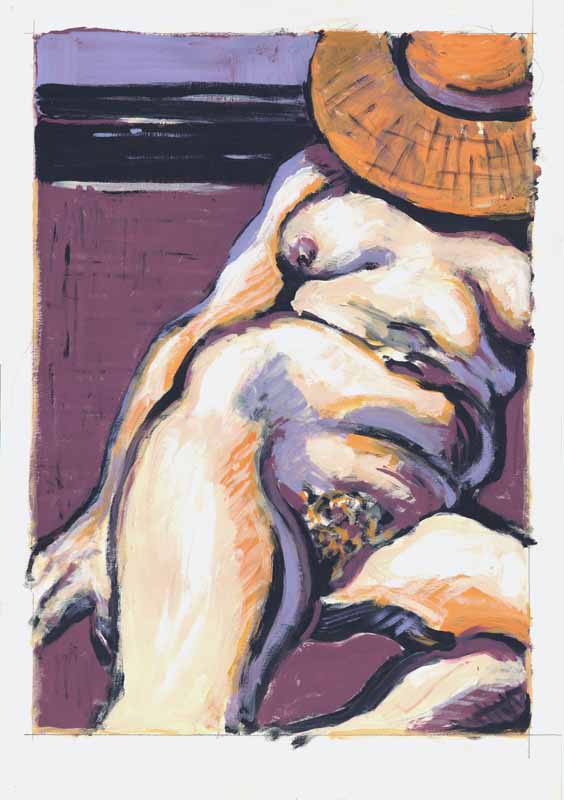 Frau mit Hut auf violetter Decke liegend, 1986, 65 x 45 cm Zeichnung: Tusche/Acryl auf Schoellers Hammer 4R Zeichenkarton