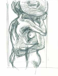 Frau vor dem Spiegel mit erhobenen Armen, 1986, Maße: 37 x 27 cm, Zeichnung: Bleistift auf beigem Zeichenpapier, Erbeng. Arndt - Reg.Nr.: E 86 - 04 / 02