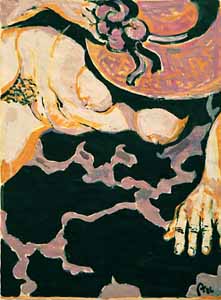 Frau mit Hut auf violetter Decke liegend, 1986, Maße: 65 x 45 cm Zeichnung: Tusche/Acryl auf Schoellers Hammer 4R Zeichenkarton, Erbeng. Arndt - Reg.Nr.: Z86- 05 / 33
