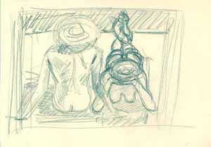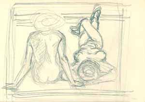 Zwei Frauen mit Hut am Strand, 1986, Maße: 24 x 30 cm, Zeichnung: Bleistift auf beigem Zeichenblockpapier, Erbeng. Arndt - Reg.Nr.: E 86 - 04 / 03