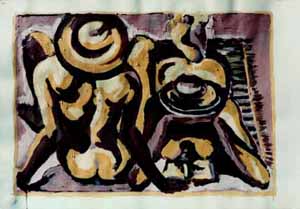 Zwei Frauen mit Hut am Strand auf Tuch liegend, 1986, Maße: 45 x 64 cm, Zeichnung: Tusche/Acryl auf Schoellers Hammer 4R Zeichenkarton, Erbeng. Arndt - Reg.Nr.: Z86- 05 / 27