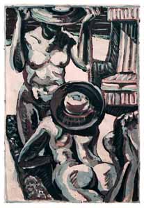 Zwei Frauen mit Hut am Strand mit Korb, 1986, Maße: 67 x 46 cm, Zeichnung: Tusche/Acryl auf Schoellers Hammer 4R Zeichenkarton, Erbeng. Arndt - Reg.Nr.: Z86- 06 / 06