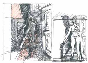 Frau Treppe hinabgehend, 1986, Maße: 41 x 58 cm Zeichnung: Tusche/Acryl auf Zeichenkarton, Erbeng. Arndt - Reg.Nr.: E86- 05 / 36