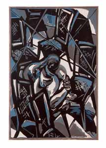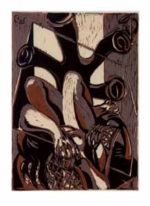 Der Mann mit den Stühlen, 1986, Maße: 67 x 45 cm Druckgrafik: Linolschnitt auf Büttenpapier, Aufl.: 25, 4 Platten, Druckinitiale lu "A.", Reg.Nr.: L86- 02 / 10