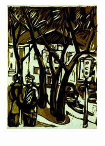 Bäume in der Stadt, 1986, Maße: 30 x 21 cm Druckgrafik: Linolschnitt auf Büttenpapier, Aufl.: 25, 3 Platten, Druckinitiale lu "A.", Reg.Nr.: L86- 29 / 22
