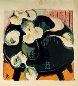 Calablüten, 1956/1986, Maße: 51 x 50 cm Druckgrafik: Siebdruck/Linolschnitt auf Druckpapier, (Unvollständiger Siebdruck von 1956 mittels Linoldruck 1986 fertiggestellt), Aufl.: 10, 3 Platten, Druckinitiale lu "A.", Reg.Nr.: L86- 29 / 06