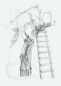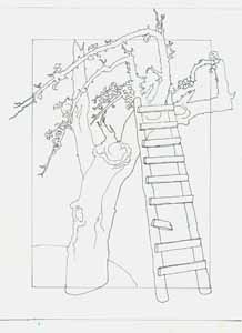 Kleiner Apfelbaum mit Leiter, 1986, Maße: 31 x 23 cm Zeichnung: Entwurf, Bleistift auf Schoellers Hammer 4R Zeichenkarton, Erbeng. Arndt - Reg.Nr.: Z86- 04 / 18