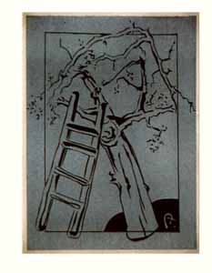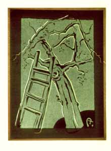 Kleiner Apfelbaum mit Leiter,grau, 1986, Maße: 31 x 23 cm Druckgrafik: Linolschnitt auf Büttenpapier, Aufl.: 20, 3 Platten, Druckinitiale ru "A.", Reg.Nr.: L86- 29 / 09