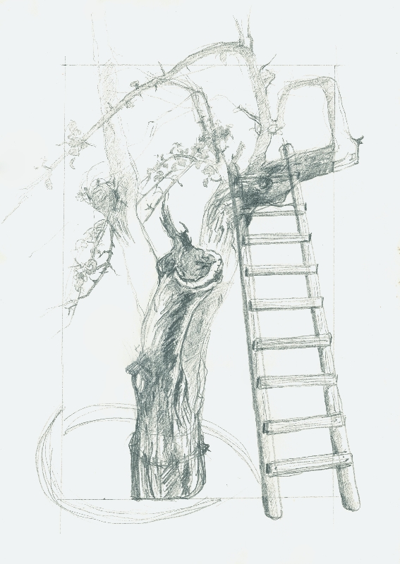 Apfelbaum mit Leiter, 1987, 57 x 40 cm, PM: 59 x 42 cm, Zeichnung: Bleistift auf beigem Felix Schoeller Turm Zeichenkarton