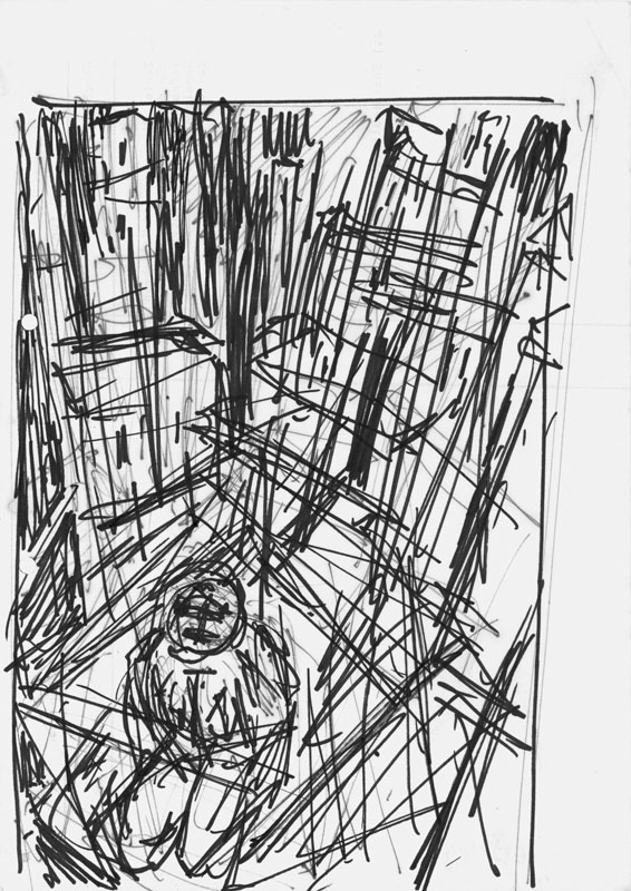 Cager in der Stadt, 1987, 29,6 x 21 cm, Zeichnung: Entwurf, Tusche auf gelochtem Kopierpapier
