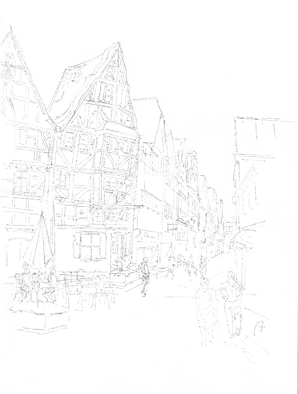 Platz in Limburg a.d. Lahn - Altstadtansicht, 1987, 32,5 x 25 cm, Zeichnung: Bleistift auf Büttenpapier