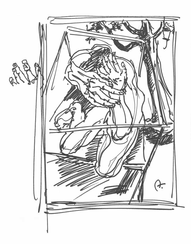 Cager mit Baum, 1988, 37 x 29 cm, Zeichnung: Entwurf in Tusche auf Zeichenkarton