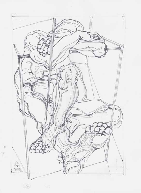 Dreibein, 1988, 60 x 42 cm, Zeichnung: Entwurf in, Tusche auf Zeichenkarton für Linolschnitt (spiegelverkehrt)