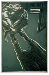 Sitzender mit Kopf in den Händen (Der Einsame), 1988, 68 x 45 cm, Druckgrafik: Linolschnitt auf Büttenpapier, Aufl.: 25, 3 Platten, Druckinitialen ru "16.II.1988 A.", Reg.Nr.: L 88 - 02 / 09