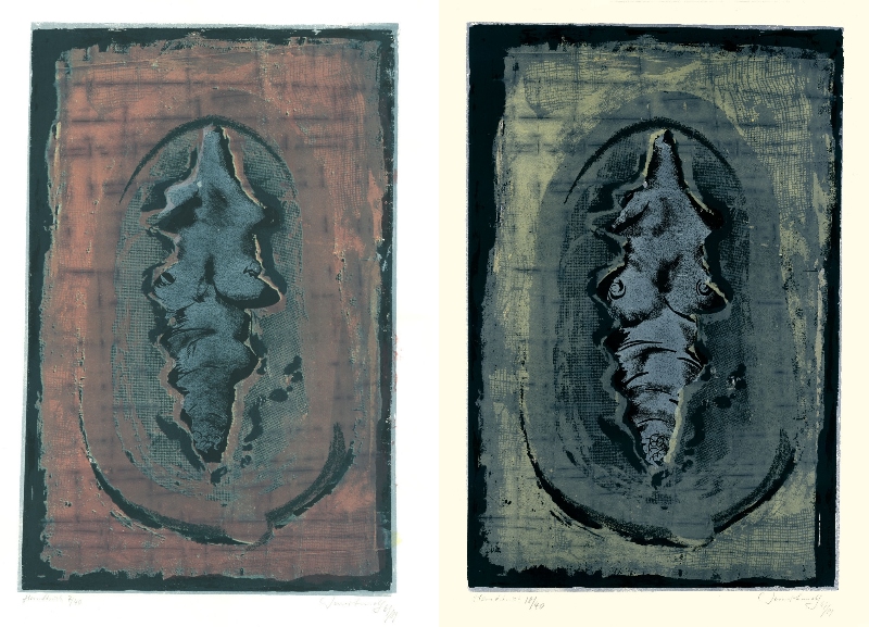 Seltener Durchblick, 1989, 62,5 x 44,5 cm, PM: 79 x 53 cm; Zeichnung: Entwurf für die Neugestaltung eines Siebdrucks von 1969; Tempera auf Büttenpapier, 2 Farbversionen