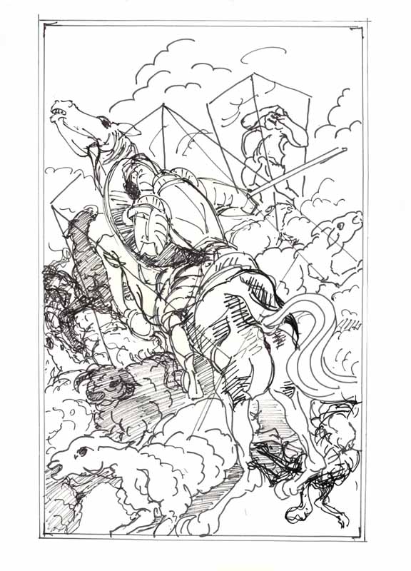 Don Quijote im Cager, 1990, 57 x 36 cm, PM: 62,5 x 45 cm, Zeichnung: Entwurf für eine Druckgrafik, Tusche/Acryl auf Felix Schoeller Turm Zeichenkarton