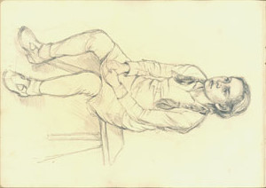 Seite 20 (Selbstbildnis mit Frau und Kind in Tusche und Bleistift) / Seite 21 (Porträt eines Mannes mit Hut in Tusche)