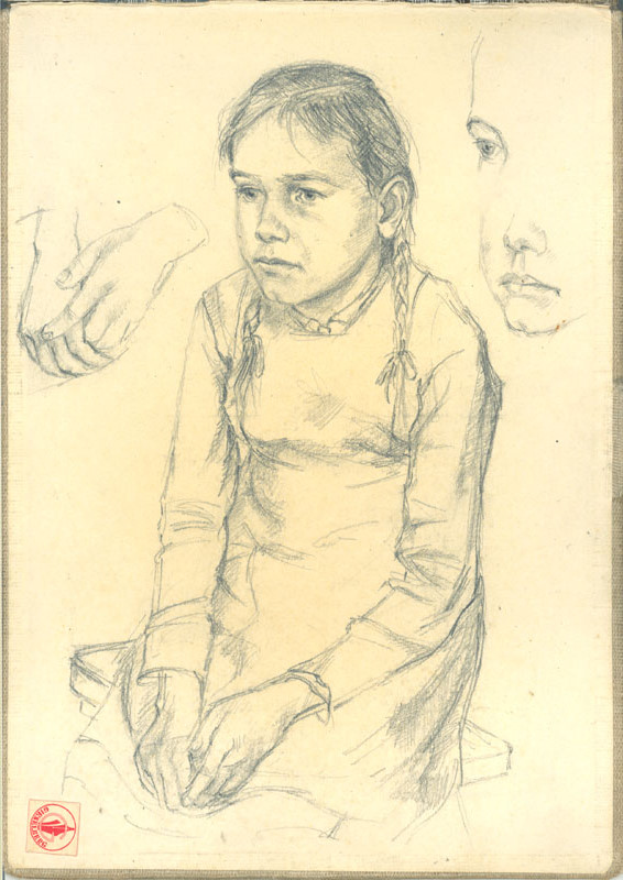Vorsatzpapier des Rückdeckels hinten (Junge Frau und Hand- und Kopfskizze)